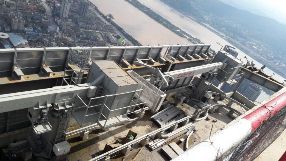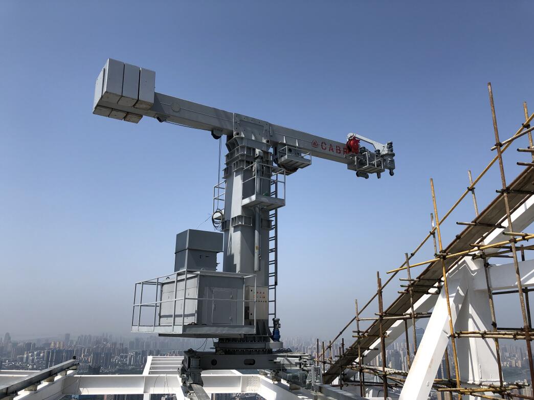 該項(xiàng)目所配備的屋面軌道式擦窗機(jī)工作高度460米,采用立柱升降式機(jī)構(gòu),擦窗機(jī)卷揚(yáng)機(jī)構(gòu)為特殊定制。擦窗機(jī)在停機(jī)時(shí)可實(shí)現(xiàn)隱藏效果。