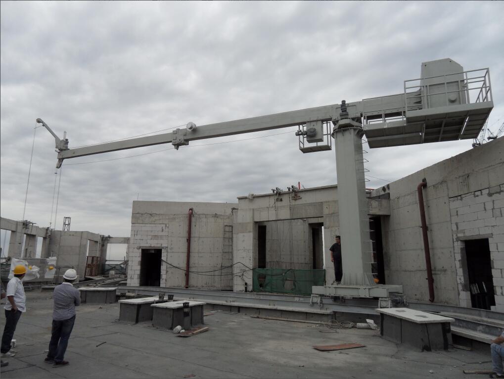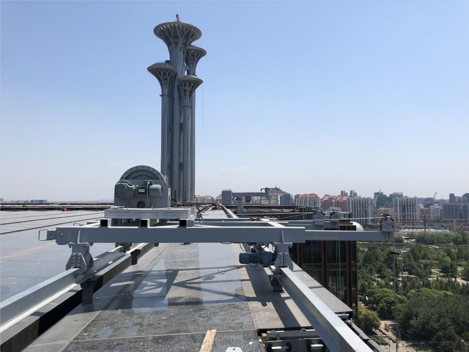 該項(xiàng)目采用3臺屋面軌道式吊臂伸縮設(shè)備,其中2臺擦窗機(jī)立柱高度在13-17米,采用二級升降系統(tǒng),盡可能地降低了設(shè)備的停機(jī)高度。